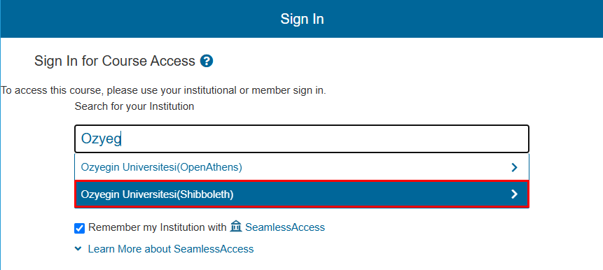 In the search field, type "Ozyegin" and choose "Ozyegin Universitesi (Shibboleth)."