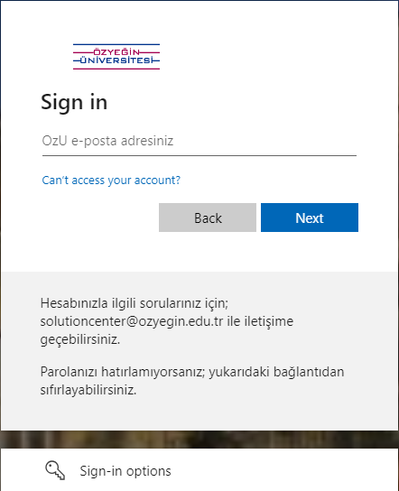 Log in using your Özyeğin account with the "@ozyegin.edu.tr" or "@ozu.edu.tr" extension.